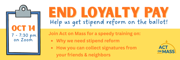 Second, as we ramp up towards the ballot, some of you may have already attended a training hosted by the Stipend Reform campaign. In response to requests, Act on Mass will be hosting our own short Stipend Reform Training: why we need this reform and how you can pitch in. Join Act on Mass Board Member Hewon and I for a quick Zoom training on October 14th, 7 - 7:30 pm.