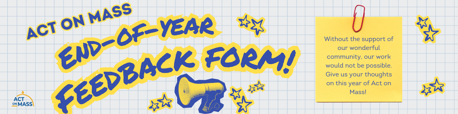 Although our legislators may not be big fans of accountability, Act on Mass is. As we make our plans for next year, we wanted to get some feedback from our community on how our year at Act on Mass was for you. Whether you joined us at an event, volunteered with us in person, read the Saturday Scoop, or any other ways of engaging our work, we want to hear from you! Please fill out our short feedback form here: